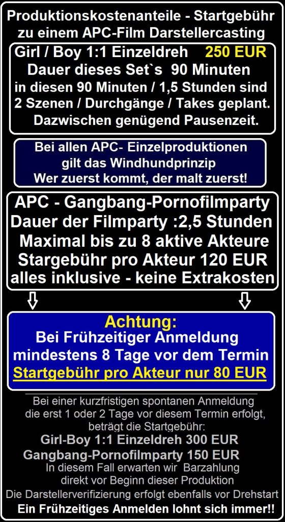 Bei unseren Veranstaltungen handelt es sich grundsätzlich immer um Filmproduktionen. KEINE SEXVERANSTALTUNG (i.S.v Prostitutionsschutzgesetz). Unsere männlichen APC-Darsteller sind Co-Produzenten und beteiligen sich als solche an den üblichen Produktionskosten wie Gesundheitstests (Selbsttests), Studiomiete, Catering, Hygieneartikel usw.